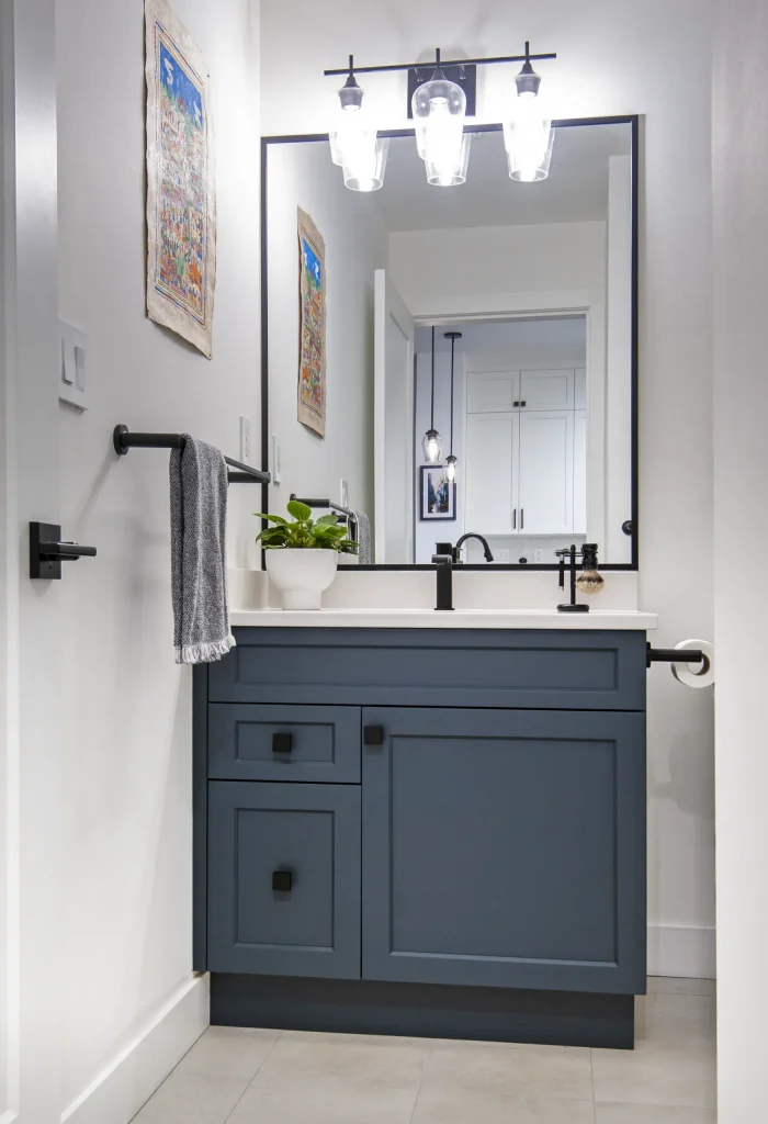 Vanity: Painted shaker cabinet in oceanic blue with square black knobs and matching black hardware; full toe-kick for a furniture-like base.